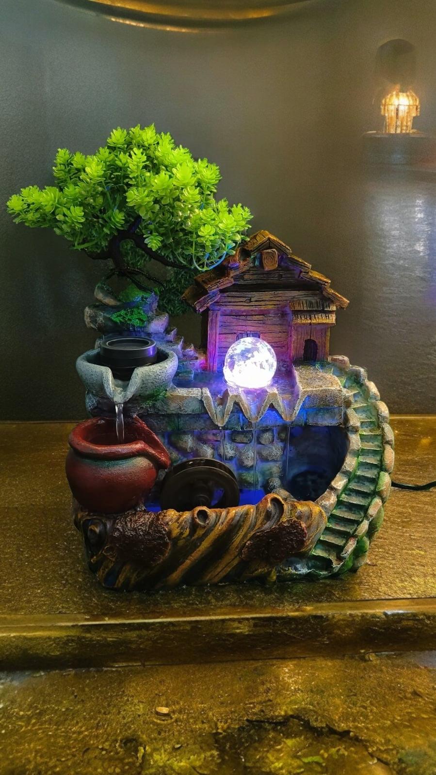 Enhance the ambiance of your home with this exquisite nature fountain. Designed with elegance and tranquility in mind, this captivating water feature combines visual beauty with soothing sounds to create a relaxing atmosphere in any space. The charming small hut and two spinning wheels add a unique touch to this stunning piece.