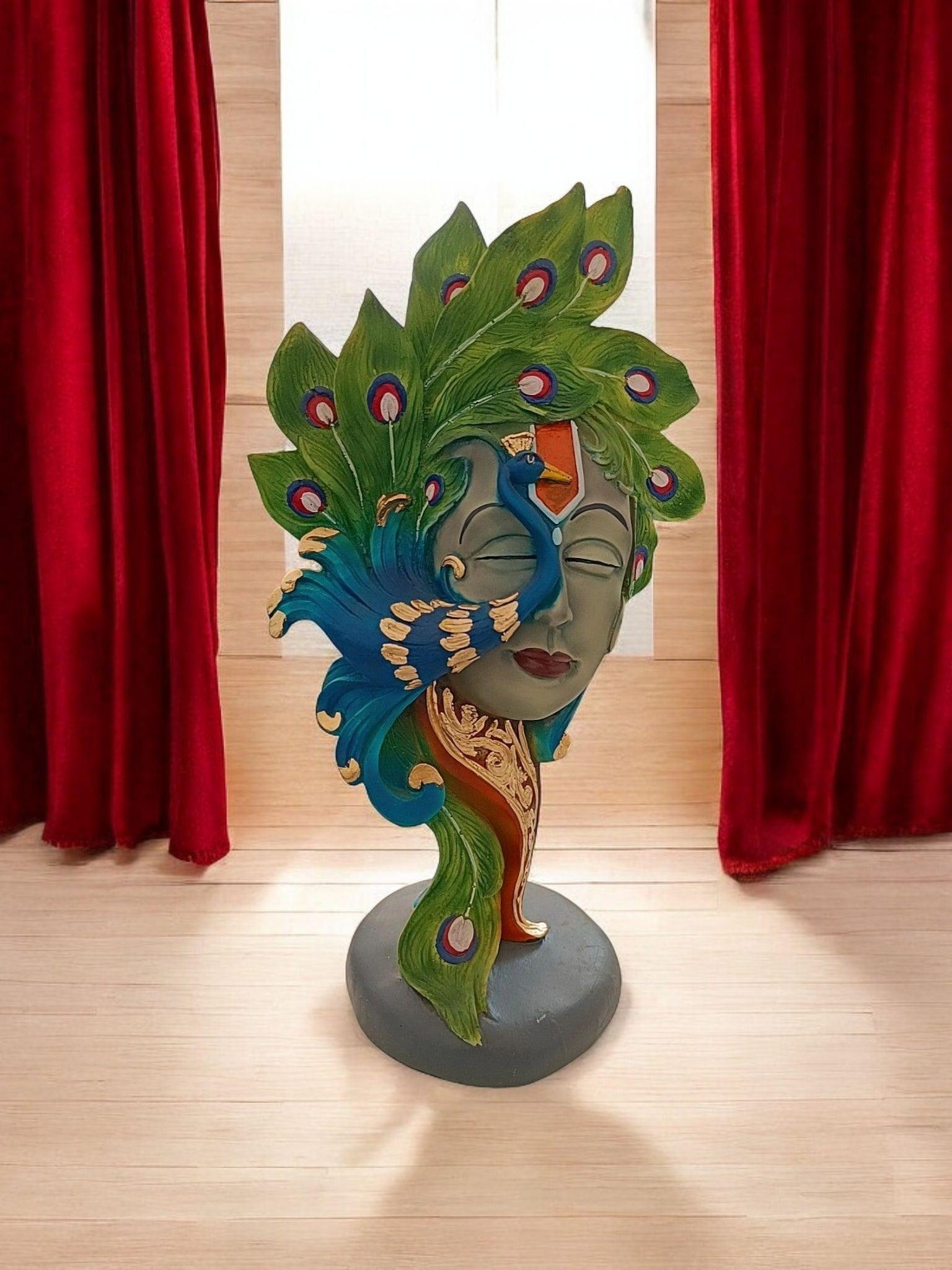 This exquisite Lord Krishna idol, crafted from high-quality polyresin, is a true masterpiece of art and devotion. The idol features vibrant colors that bring to life the serene expression of Lord Krishna. The highlight of this beautiful piece is the majestic peacock, gracefully perched near Krishna's face, symbolizing divine beauty and harmony.